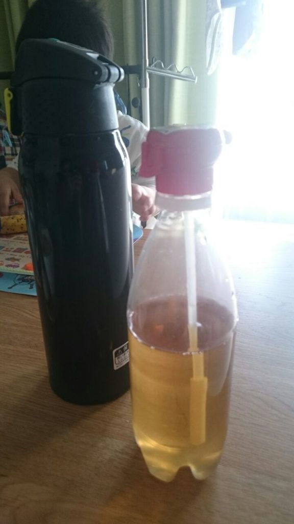 使い終わったペットボトルに、100均で買ったキャップを付けているもの。