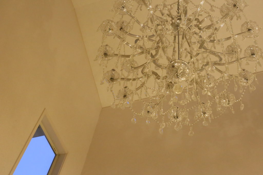 まず玄関が、大理石の床の吹き抜けで、シャンデリア。