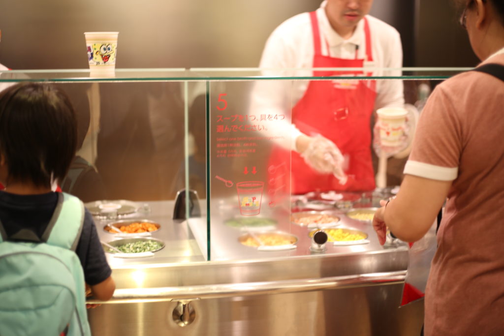 カップのお絵かきが終わったら列に並び、カップを係の人に渡して、麺→具を入れてもらいます。