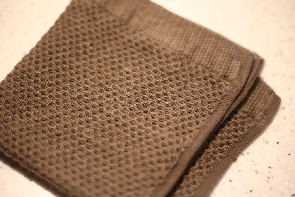 本当はいま話題の『かや布巾』にしたかったんですが、かや布巾は白っぽいものばかりで、長持ちさせたいズボラでガサツは私はどうしても濃い色の布巾にしたくて、こちらにしました。