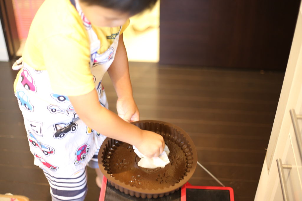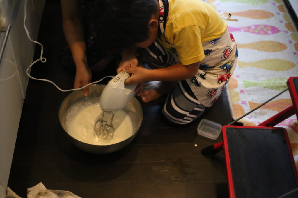 しかしこの日は、大人3人(姉、私、夫)がつきっきりでケーキ作り&次男のガードを担い、長男に思う存分キッチン作業をさせました。
