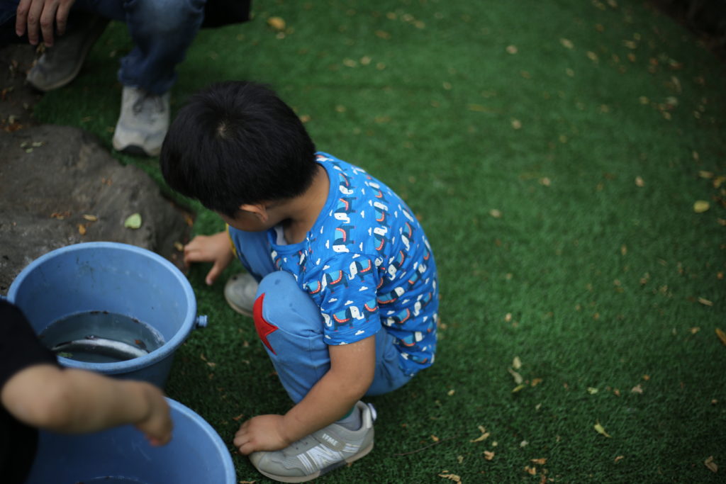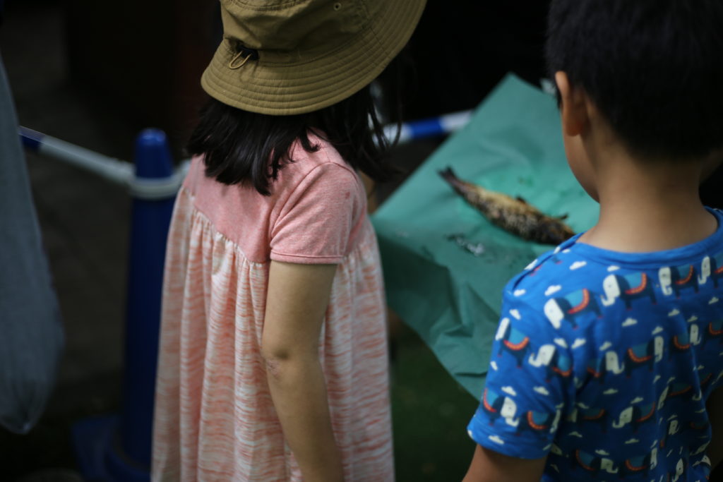 ヌルヌルする魚を触ったり、バケツに入れて眺めたり、