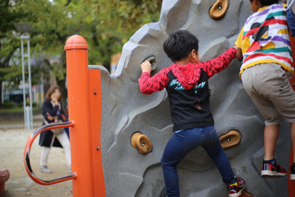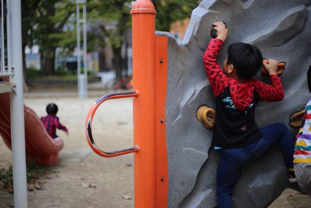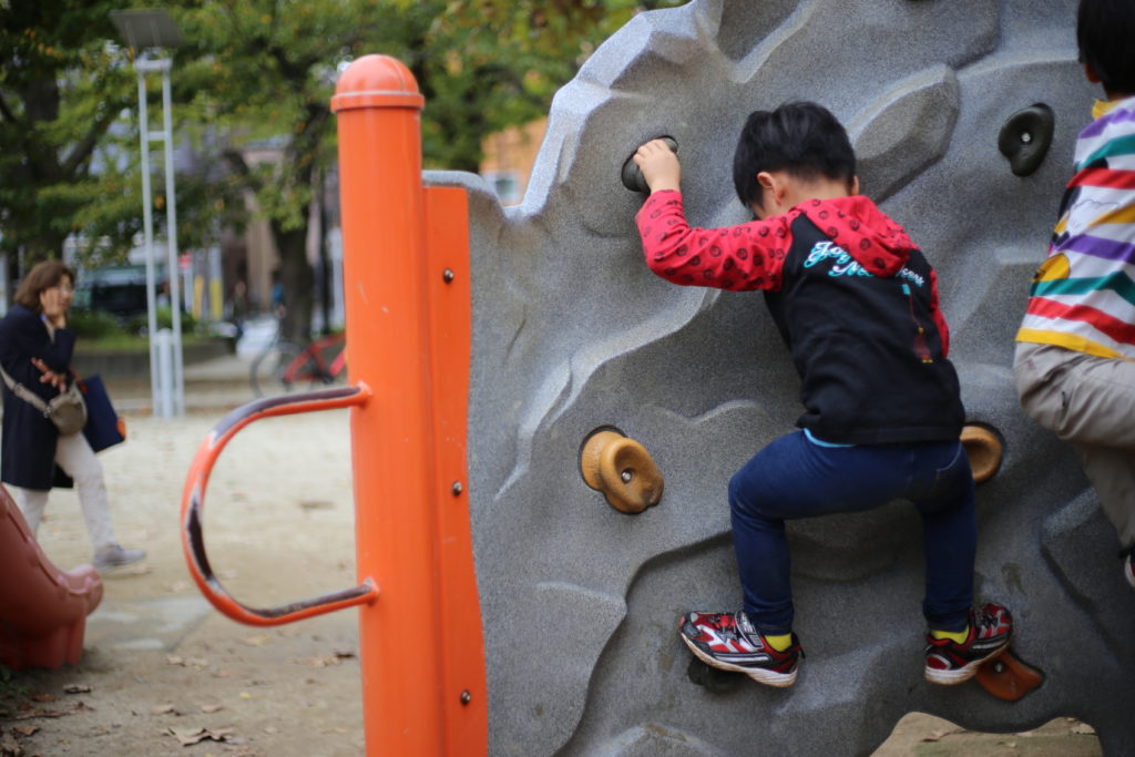 5歳長男、公園によくあるこんなボルダリング的な遊具を登り始めました。
