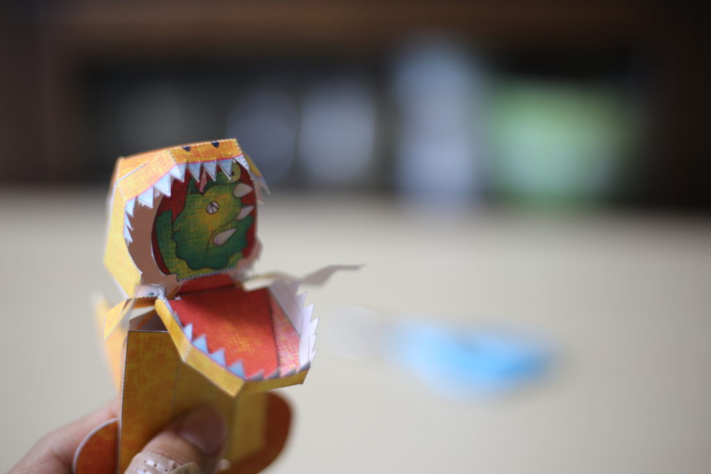 ↑これは、恐竜。夜な夜なチョキチョキ、ペタペタ、細かい作業をしまして、小一時間かけて完成しました。
