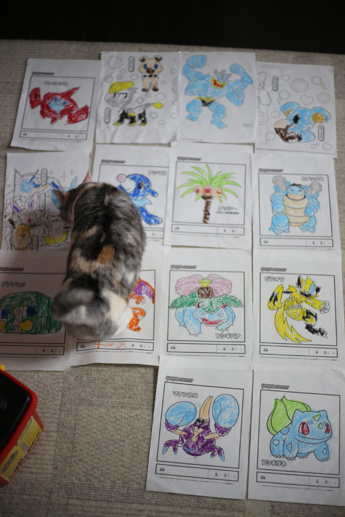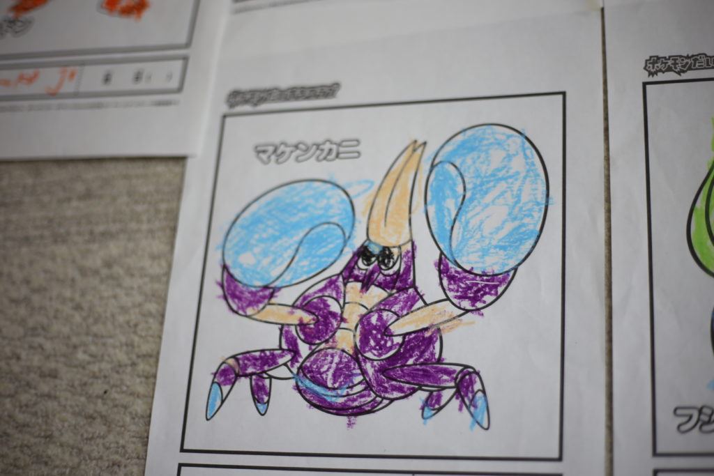 ポケモンの本を見ながら塗ったり、本に載っていない時はパソコンで画像を出してあげると、それを見ながら塗っています。