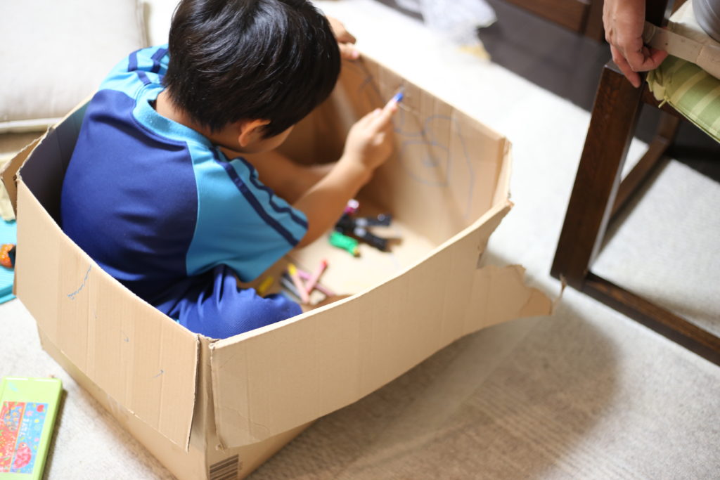 いつものクレヨン、いつものお絵かきですが、自分がダンボールの中に入って描くとなると、途端に楽しそうです。
