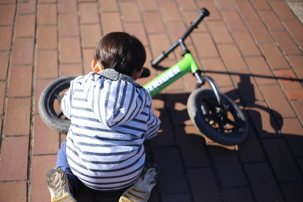サッカーボールを蹴って転げまわり、虫を捕まえていじくりまわし、ストライダーやキックボードをパパに教わりながら泥んこになって遊んでいます。