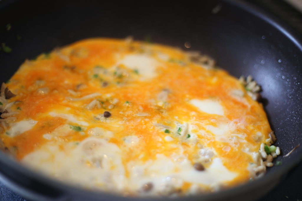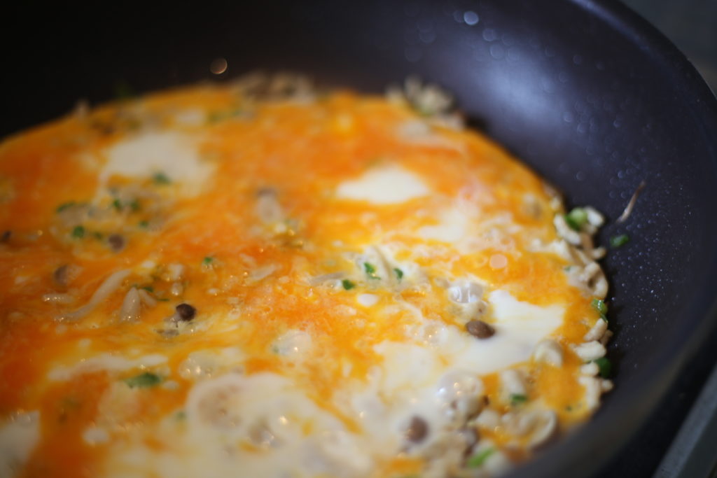 卵をジャーッと流し込んで、弱火でふたをしておけば完成。